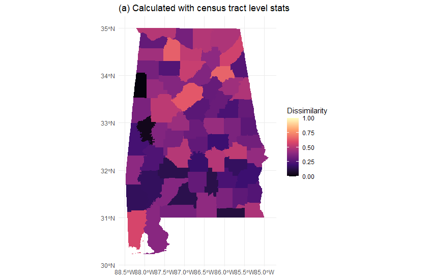 - calculating three residential segregation indices, including dissimilarity, isolation and interaction indices, at the preferred geographical level, e.g. county or census tract level